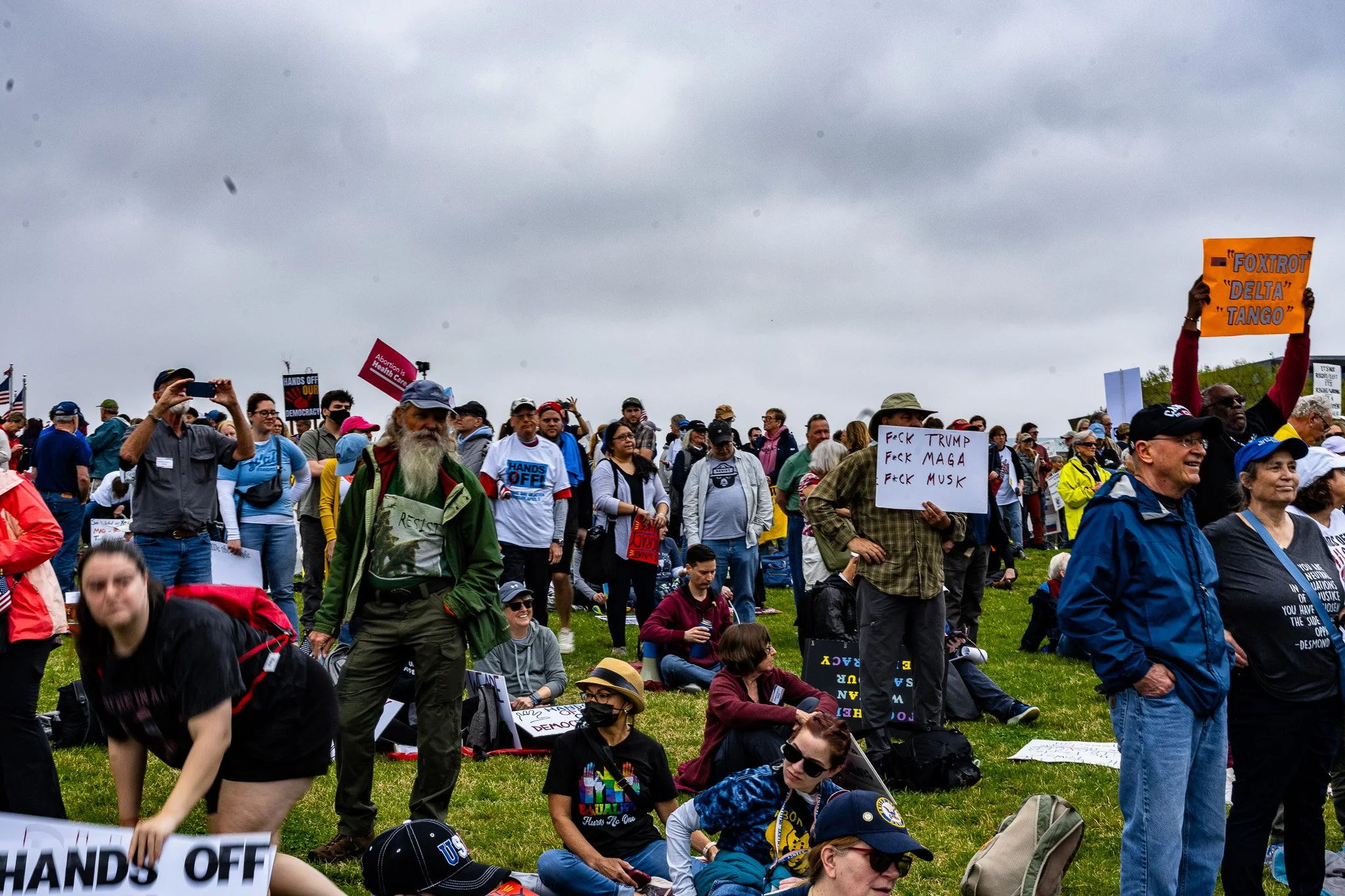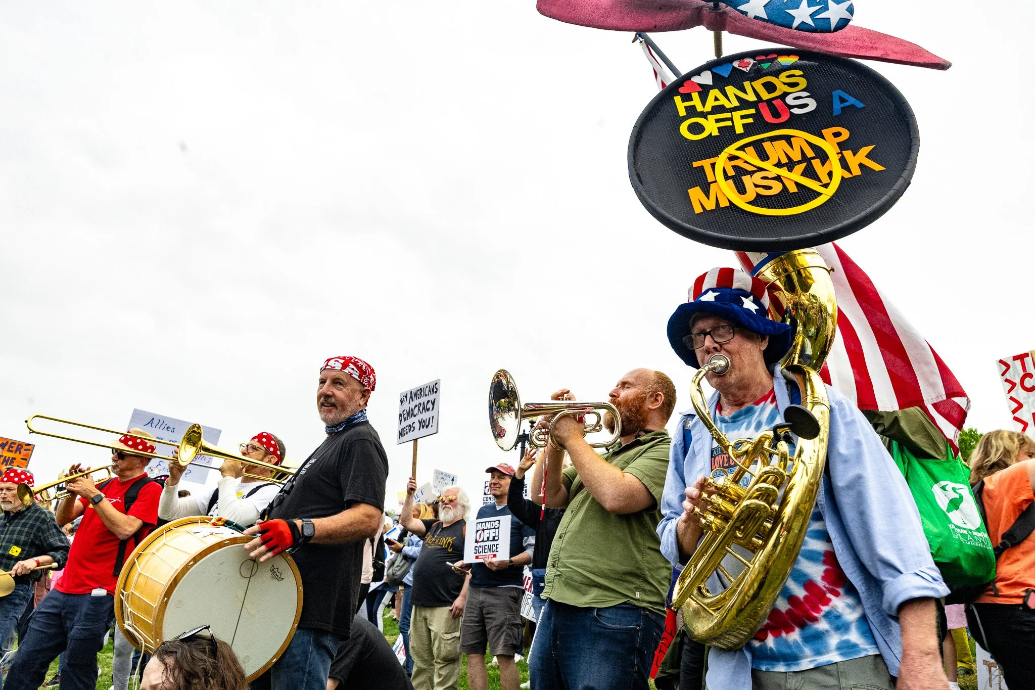 This was a broad coalition calling on the administration, DOGE, and Musk to keep in their lanes. The atmosphere was friendly and carnival-like: you might here a drum circle in one direction, over there a brass band, and over there a crowd chanting some classics. So the crowd milled and mixed, joyfully in a joyless time, and there was no counter-protest—apart from two individuals (shown later on) out of tens of thousands.